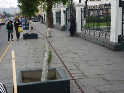 Como muestra la imagen, en la Plaza Bolívar no había manifestantes, marchas o personas protestando. Nadie. Sólo inocentes transeúntes acostumbrados a encontrarse con este tipo de demostraciones de poder y jerarquía trasnochados, inútiles, ridículos. A alguien se le ocurrió cerrar una parte de la vereda, delimitarla con sogas como si fuera de su propiedad y no dejar pasar a nadie por ella. Marcar los límites de su feudo que nadie debe pisar no solo es una arbitrariedad en estos tiempos, sino también una forma, la peor de todas, de ostentar (que no ejercer) autoridad, de señalar quién manda y en dónde y sin tener que dar explicaciones. ¡Qué mal!